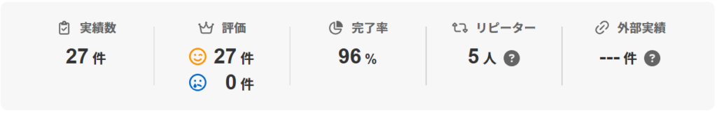 ランサーズでは、実績27件中プロジェクト完了率96%、満足評価は27件です。